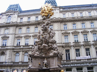 No centro da rua eleva-se no seu topo dourado de anjos e santos a coluna comemorativa do fim da peste. Viena como o resto da Europa foi visitada duas vezes pela Peste que matava gente aos milhares por este continente fora, em 1679 quando a coisa estava a ficar negra para estes lados, o Imperador Leopoldo I pegou nas suas tralhas e fugiu para bem longe, provavelmente não deve ter sido coisa que caísse nas boas graças dos vienenses e diz a história que o Imperador encomendou a construção de um monumento comemorativo ao fim da Peste, talvez até uma forma subtil de apagar a ira daqueles que ficaram sujeitos a morrer com uns bubões de pus, quem vai saber?!